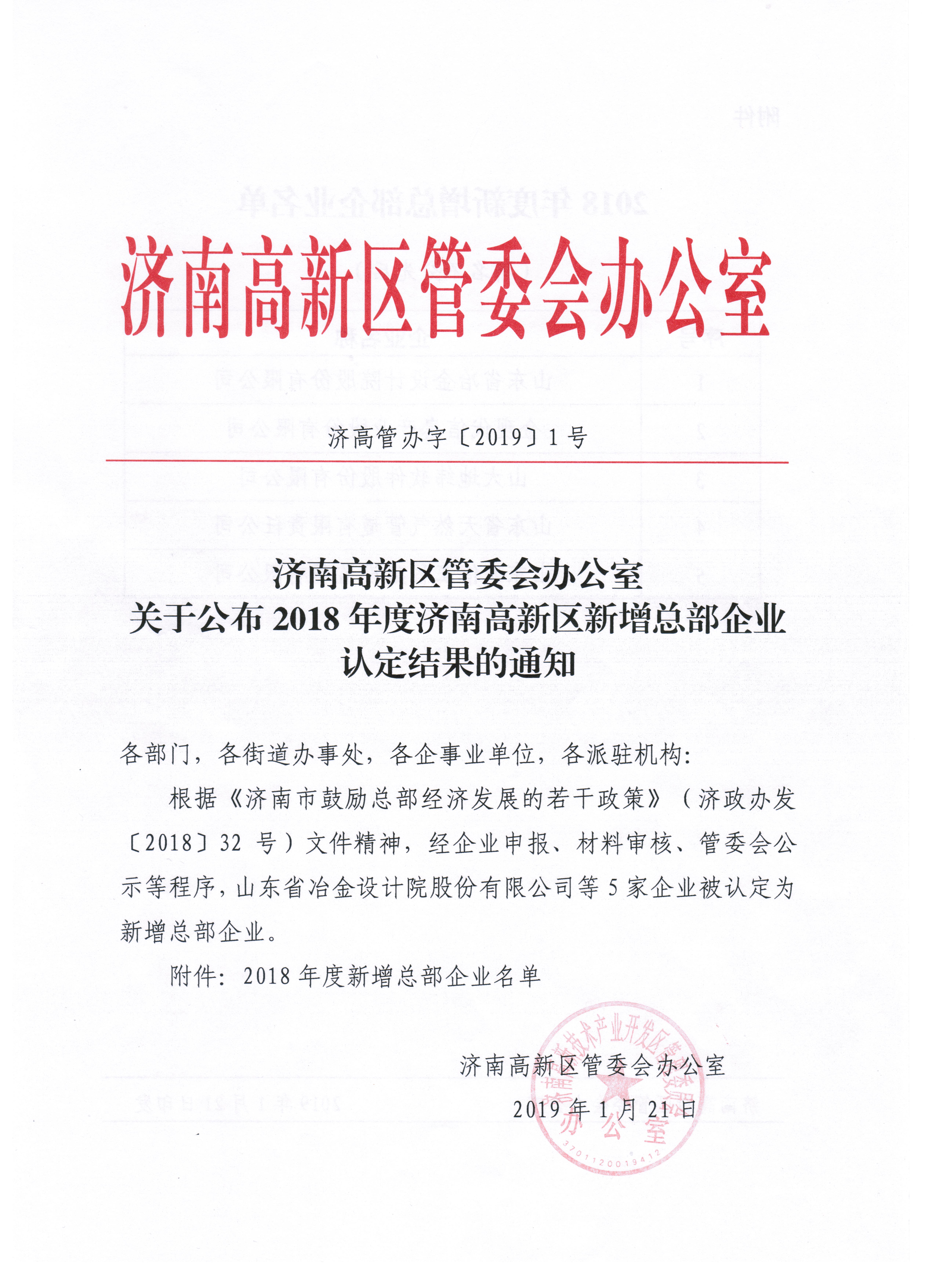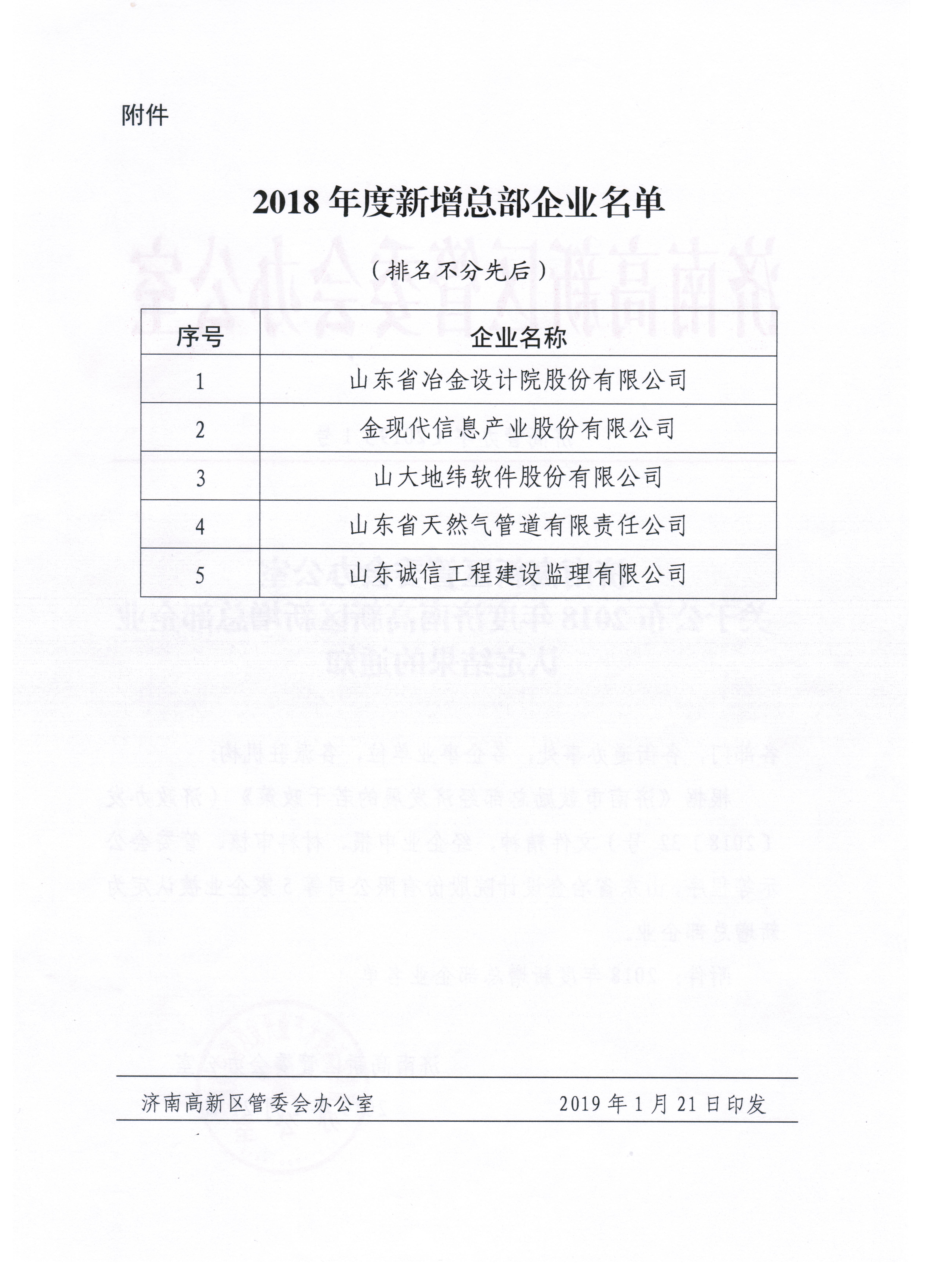 近日,山東省冶金設(shè)計(jì)院股份有限公司被濟(jì)南市認(rèn)定為首批“總部企業(yè)”。這標(biāo)志著我公司的綜合實(shí)力以及對地方發(fā)展的貢獻(xiàn)得到了濟(jì)南市政府的高度認(rèn)可。