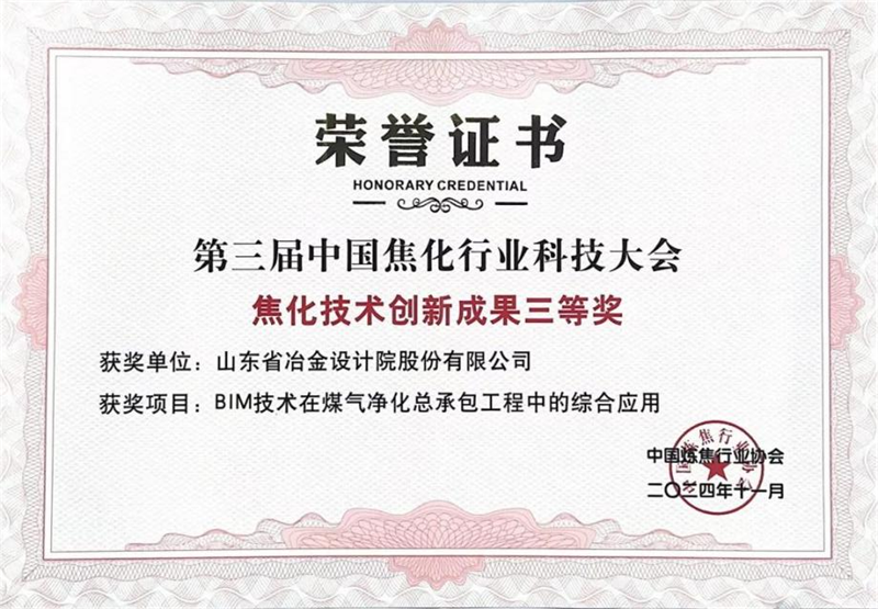 三等獎:BIM技術在煤氣凈化總承包工程中的綜合應用;焦化初冷器余熱-循環(huán)氨水余熱-上升管余熱耦合技術研究與應用。